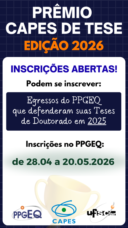 A Coordenação do Programa de Pós-Graduação em Engenharia Química (PPGEQ/UFSCar) torna pública a abertura das inscrições para a seleção interna do Prêmio CAPES de Tese – Edição 2026. O objetivo é selecionar a melhor tese defendida no âmbito do Programa para representar o PPGEQ na premiação nacional.